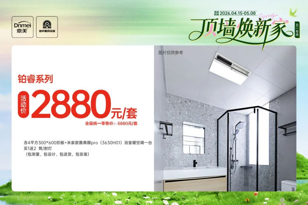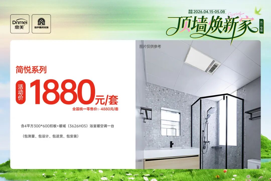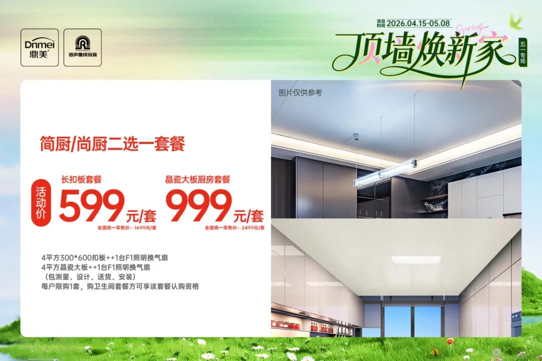 6大厨卫套餐,最低599元/套,涵盖长扣板和晶瓷大板两种吊顶方案,搭配照明灯具,以及爆款电器,不同配置,以供选购!