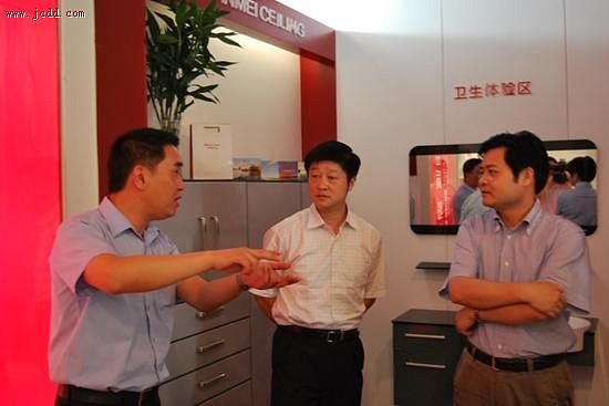 总经理张轲(左一)向秀洲区区委书记祝亚伟(中)上虞市市委书记叶时金(右一)介绍企业科技创新