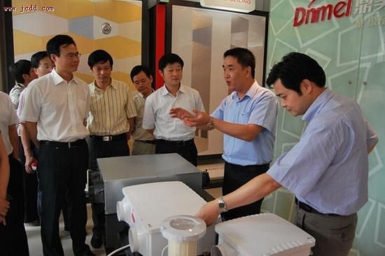 7月3日,由上虞市委书记叶时金、市委副书记陈志君、市委常委、政法委书记陈泉标、市政府副市长潘立峰率领的上虞市党政代表团一行24人在秀洲区区委书记祝亚伟、区委常委、常务副区长祁海龙、区委常委、政法委书记陶深明陪同下考察 “秀洲区中心镇和经济强镇培养建设情况”。代表团首先考察了秀洲区科技创新的代表企业——鼎美电器。总经理张轲、副总经理钱霞、副总经理陈龙等领导接待了代表团一行。